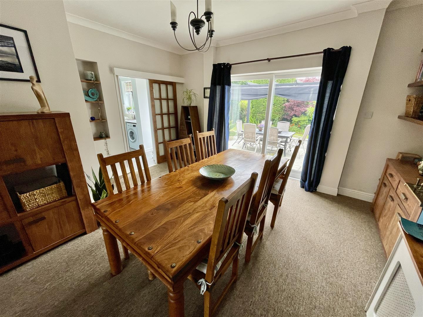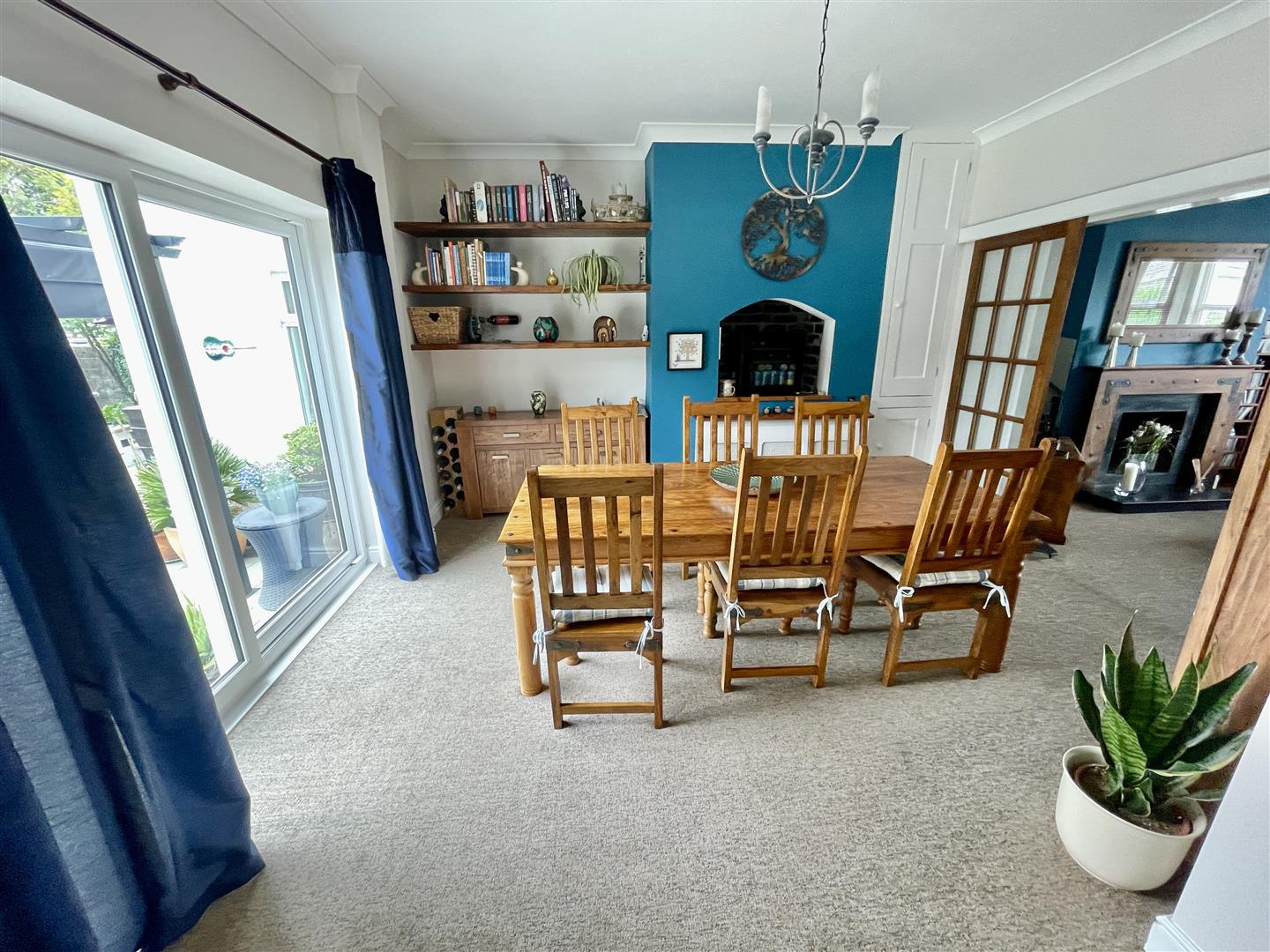 Wide patio style uPVC double glazed window overlooks and opens to the rear garden. Feature raised former fireplace opening. Storage cupboard to the right and shelving to the left.