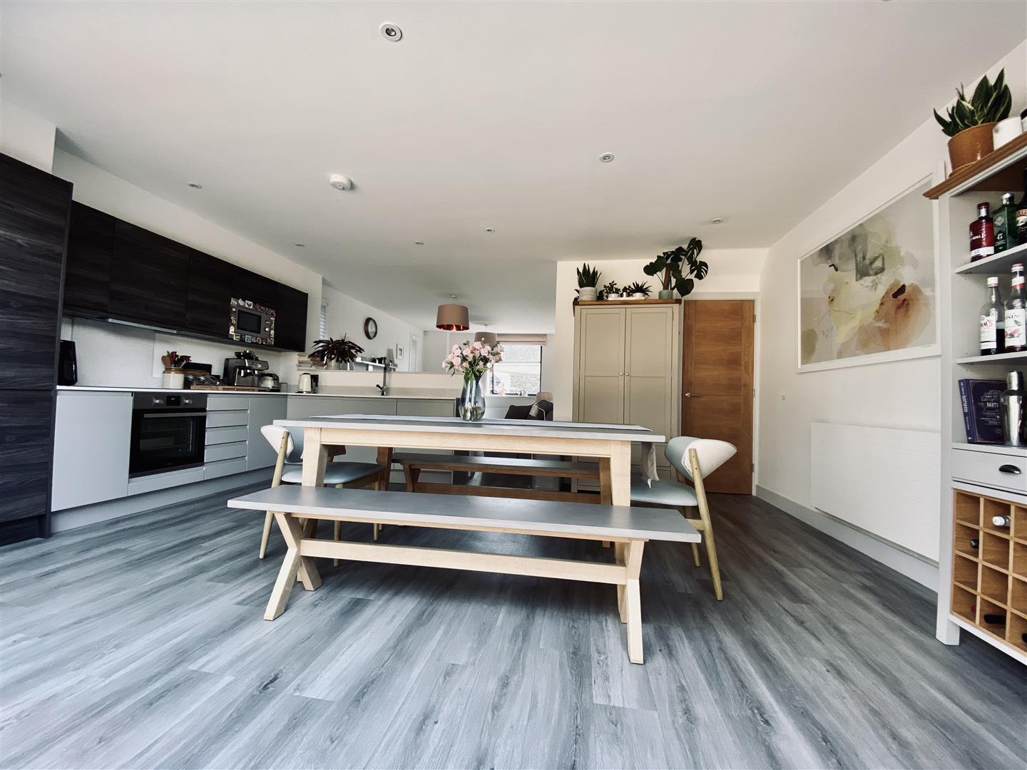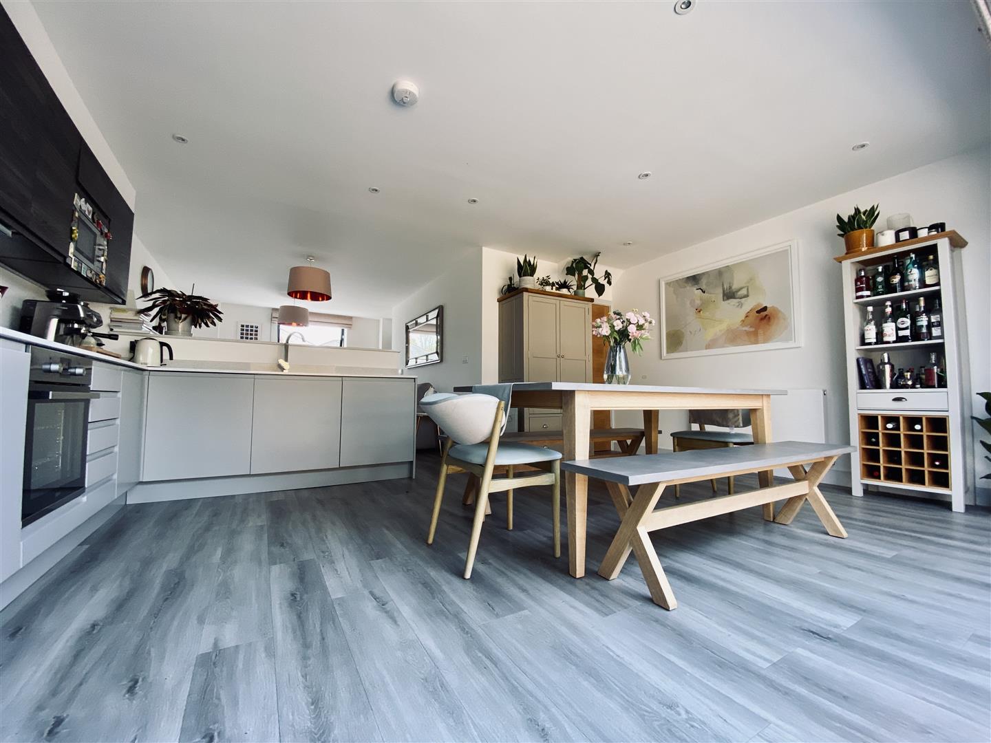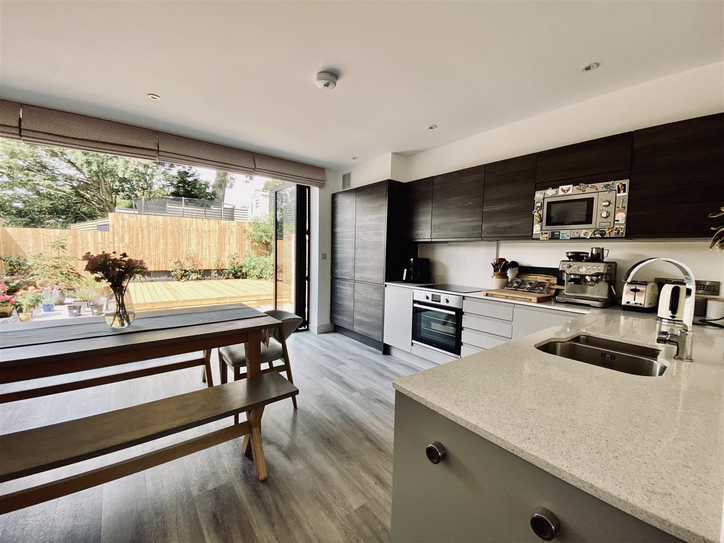 Attractive matching base and wall mounted units, two tone, with integrated washer dryer, dishwasher, oven and also a microwave. Roll edge quartz worktop with inset four ring induction hob and a one and a half bowl stainless steel sink unit with drainer lines incorporated into the quartz worktop. Quartz upstands. Wall mounted boiler which is concealed in a unit. Ample space for a dining table. Ceiling spotlights. Fitted made to measure remote control blinds to the Bi folding doors which run along the rear of the property opening up out to the rear garden. Under stairs storage cupboard. Ceiling spotlights.