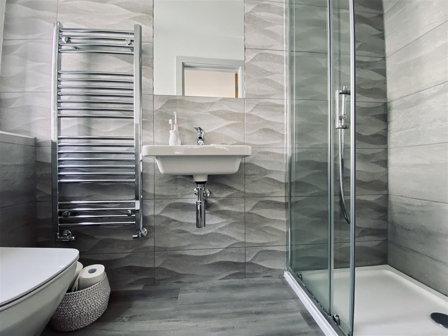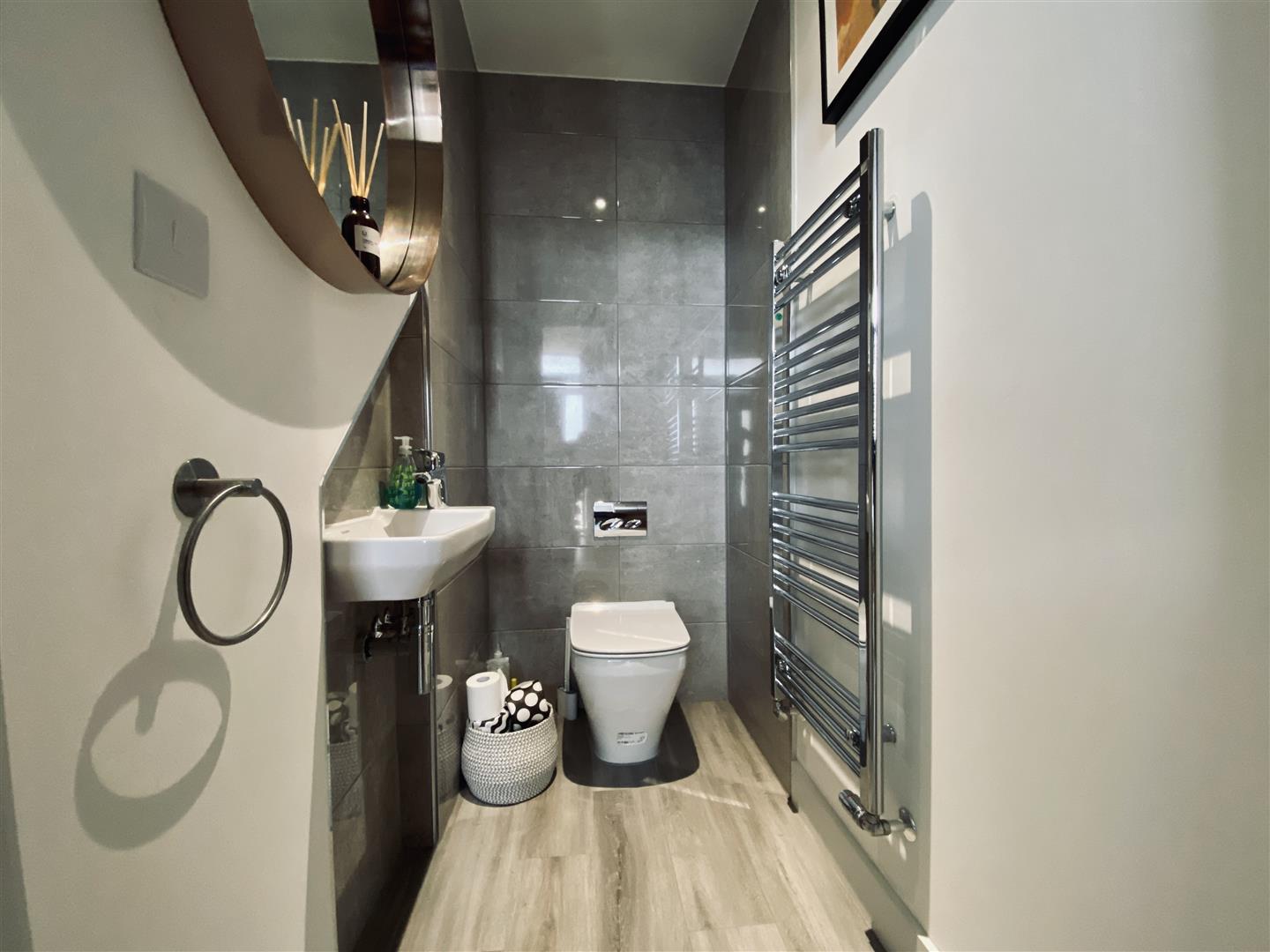 Attractive matching suite comprising close coupled WC with a hidden cistern and wall mounted wash hand basin. Chrome heated towel rail. Part tiled walls. Continuation of wood effect Karndean flooring. Ceiling spotlights.