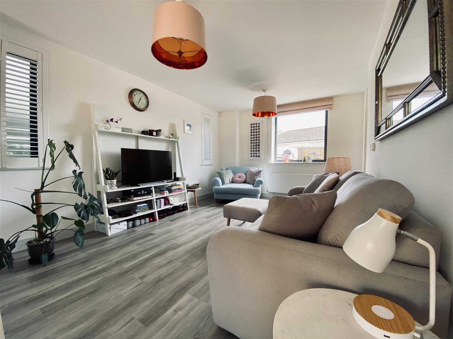 Dual aspect room with uPVC double glazed windows to the front and two to the side. Side windows are fitted with shutters. Wood effect Karndean flooring. Position for TV. Opening up into: