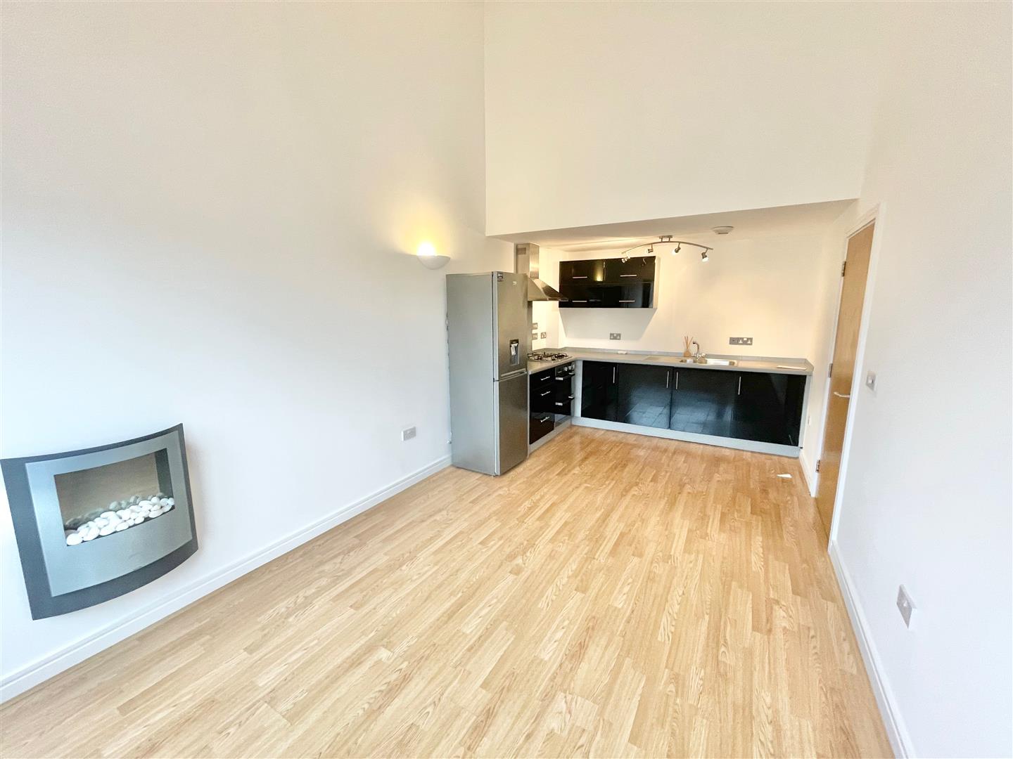 A lovely light and airy, partly vaulted room with open plan living with matching base and wall mounted units with integrated twin oven, washer/dryer and the landlord will consider including a purchased fridge freezer. Roll edge laminate work surfaces have inset one and half bowl sink unit with mixer tap and four ring gas hob, stainless steel splash-back and stainless steel extractor hood. Space for sofas and a dining table. Wall mounted contemporary electric fan fire. Laminate wood flooring. Double glazed window to front.