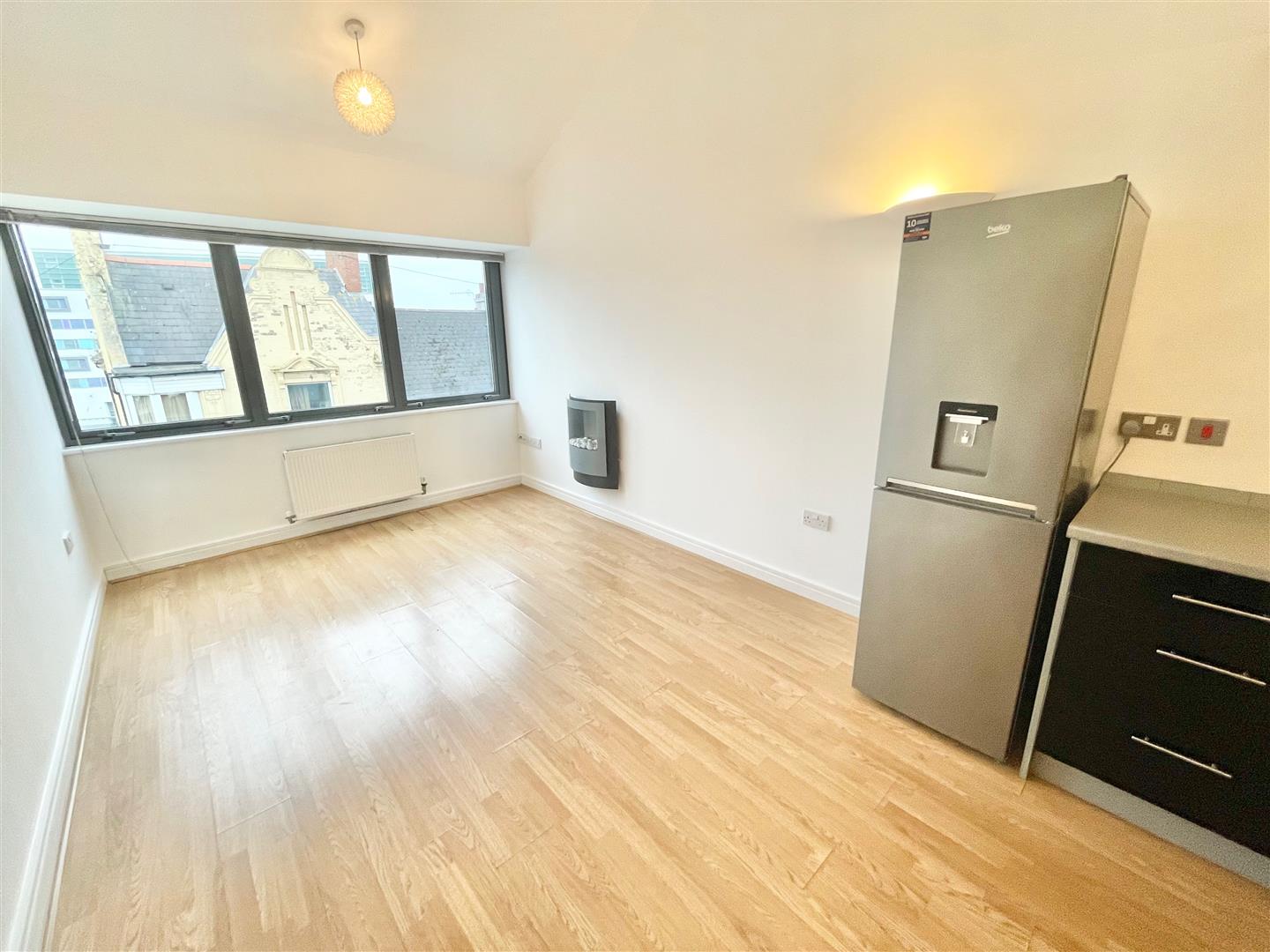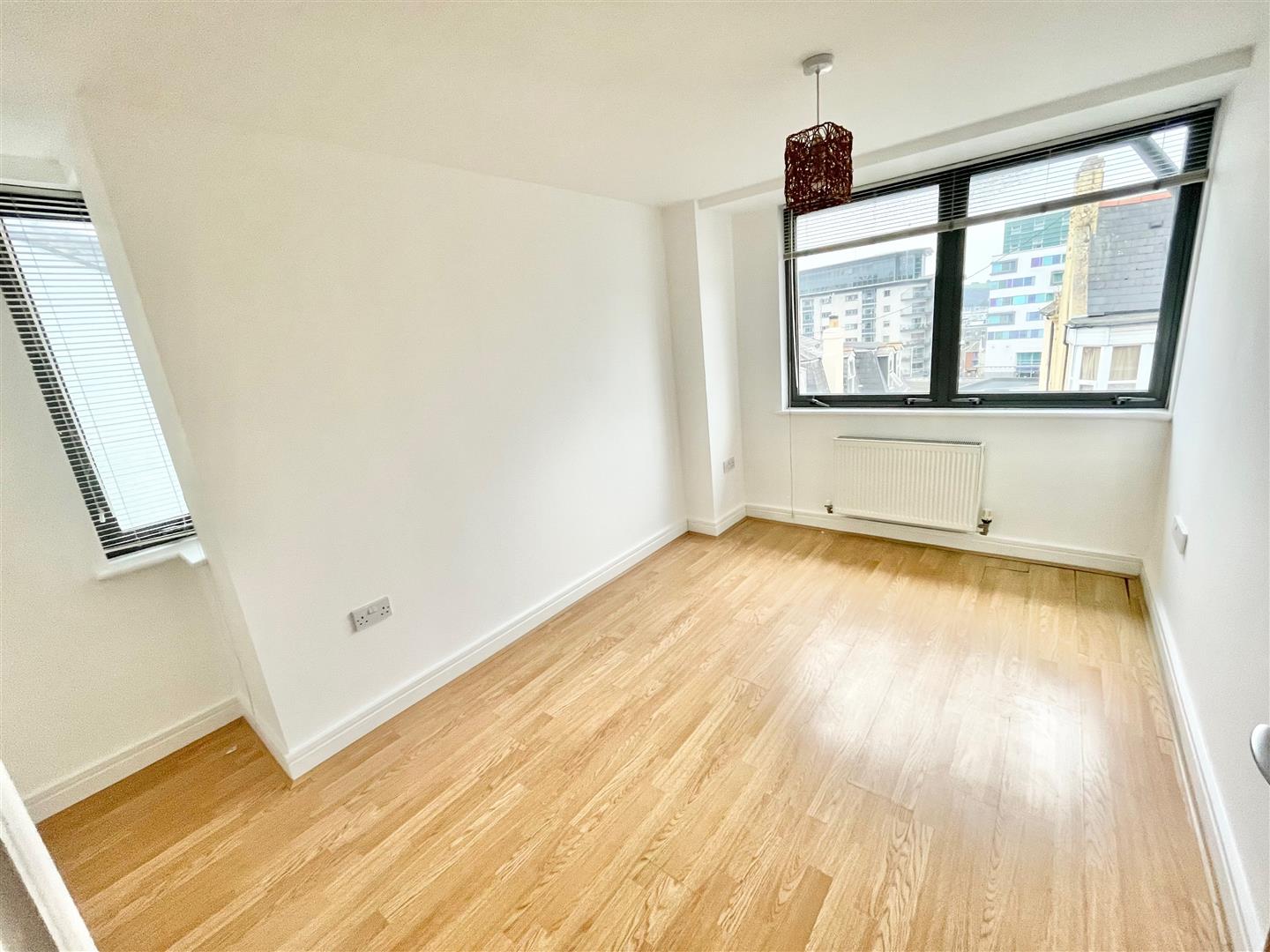 A dual aspect room with double glazed windows to front and side. Laminate wood flooring.