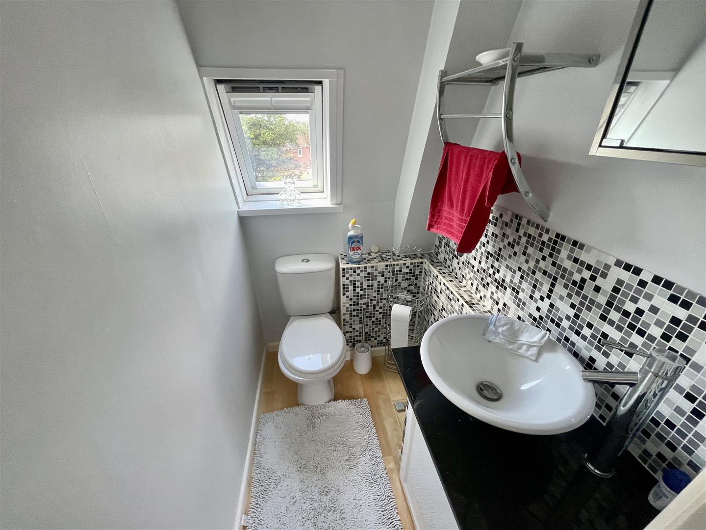 Velux double glazed window to the front. Modern suite with close coupled WC and circular vanity wash hand basin with mixer tap and cupboard under.