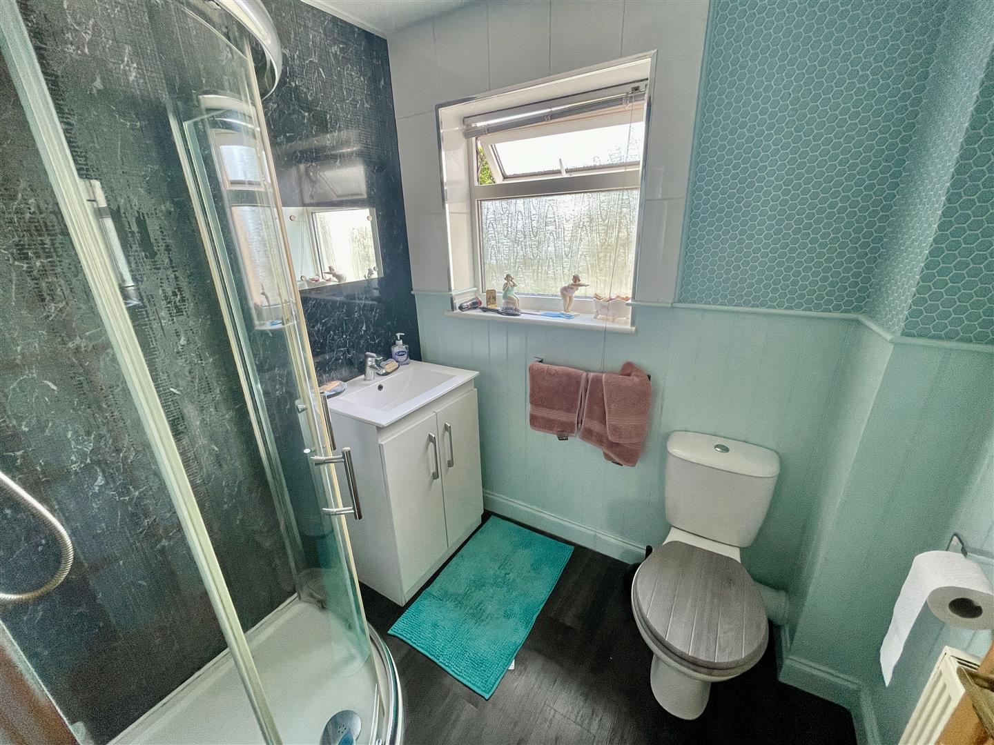 Window to the front. White modern suite with close coupled WC, vanity wash hand basin with cupboard under and mirror over and corner tiled shower with thermostatic control.