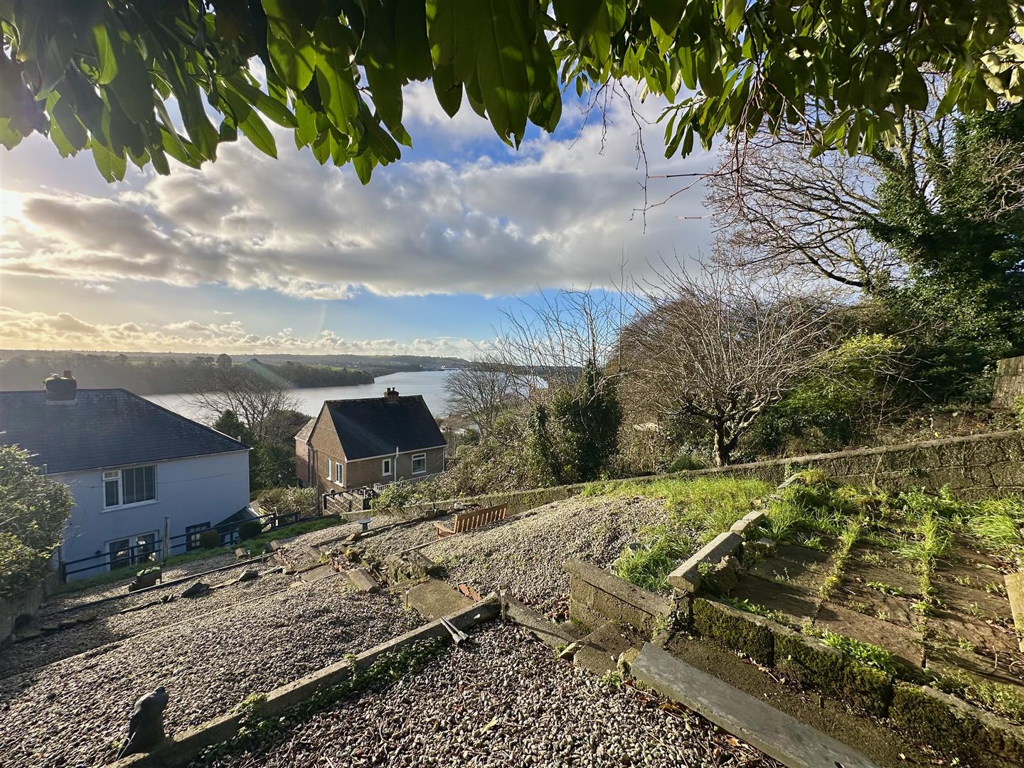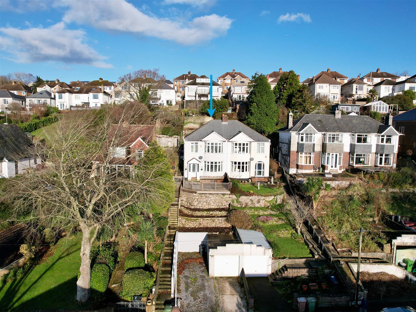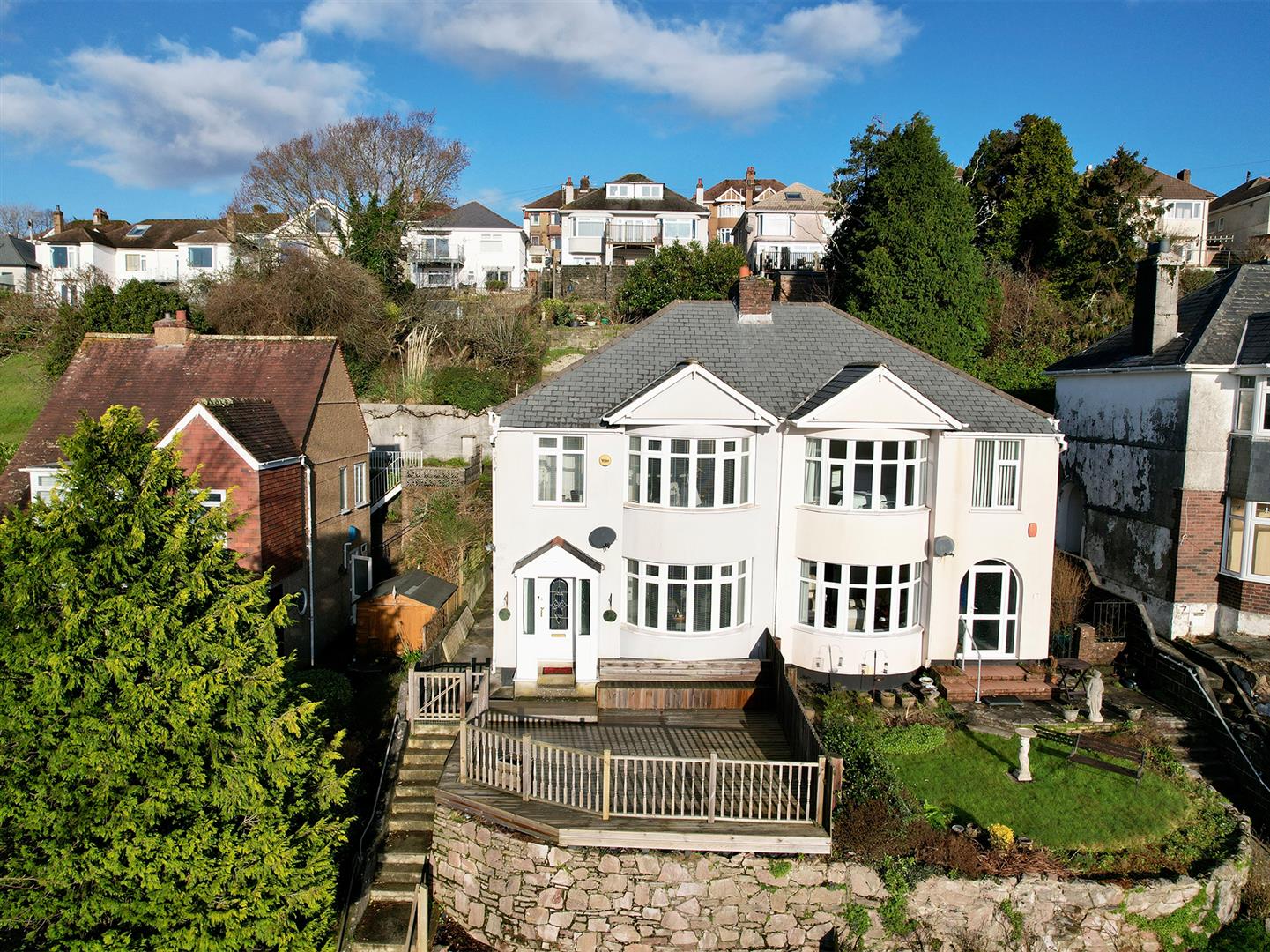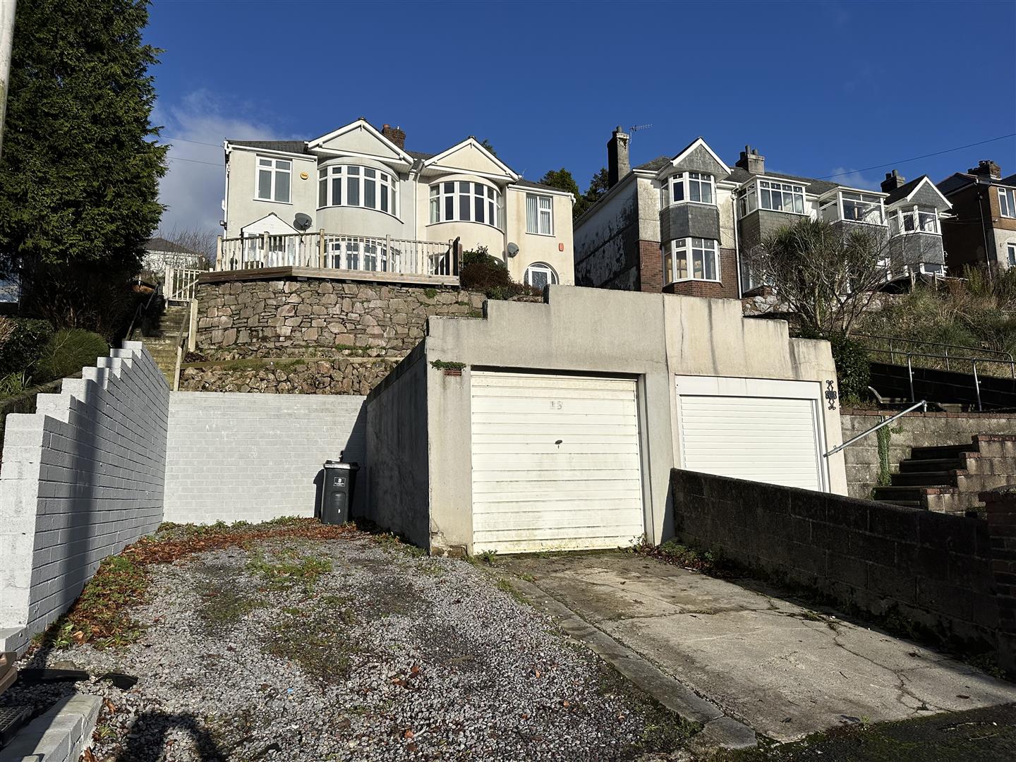The property is approached via a series of steps which leads up to a wooden gate, which opens up to the main front garden. A large decked seating area. Car parking space to the front & 2 to the side of the garage.