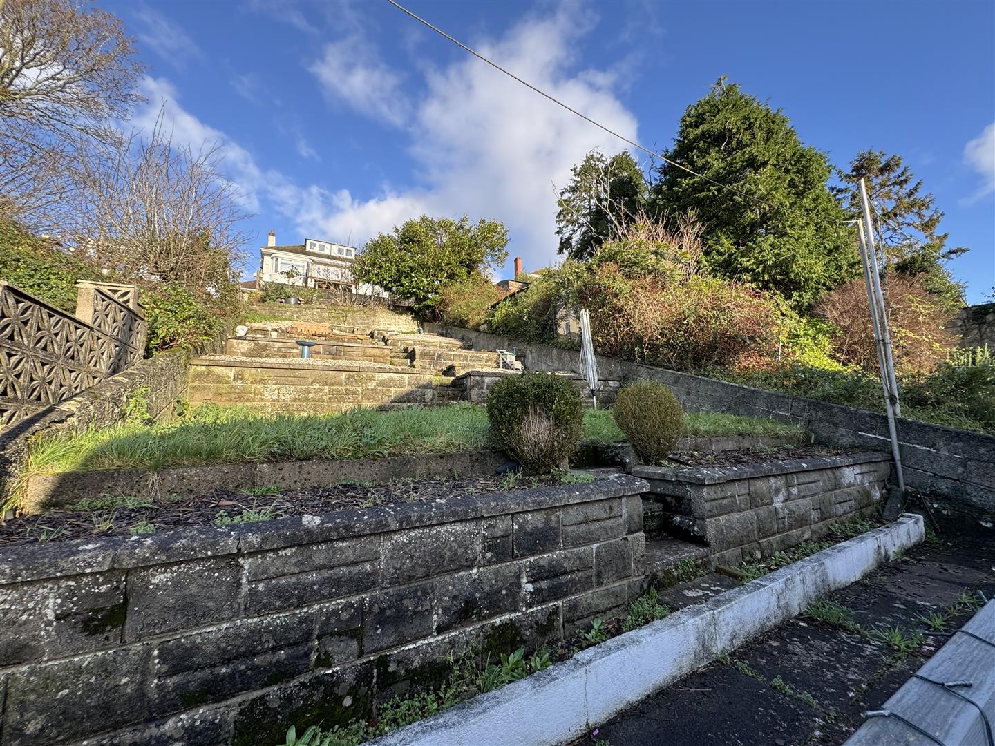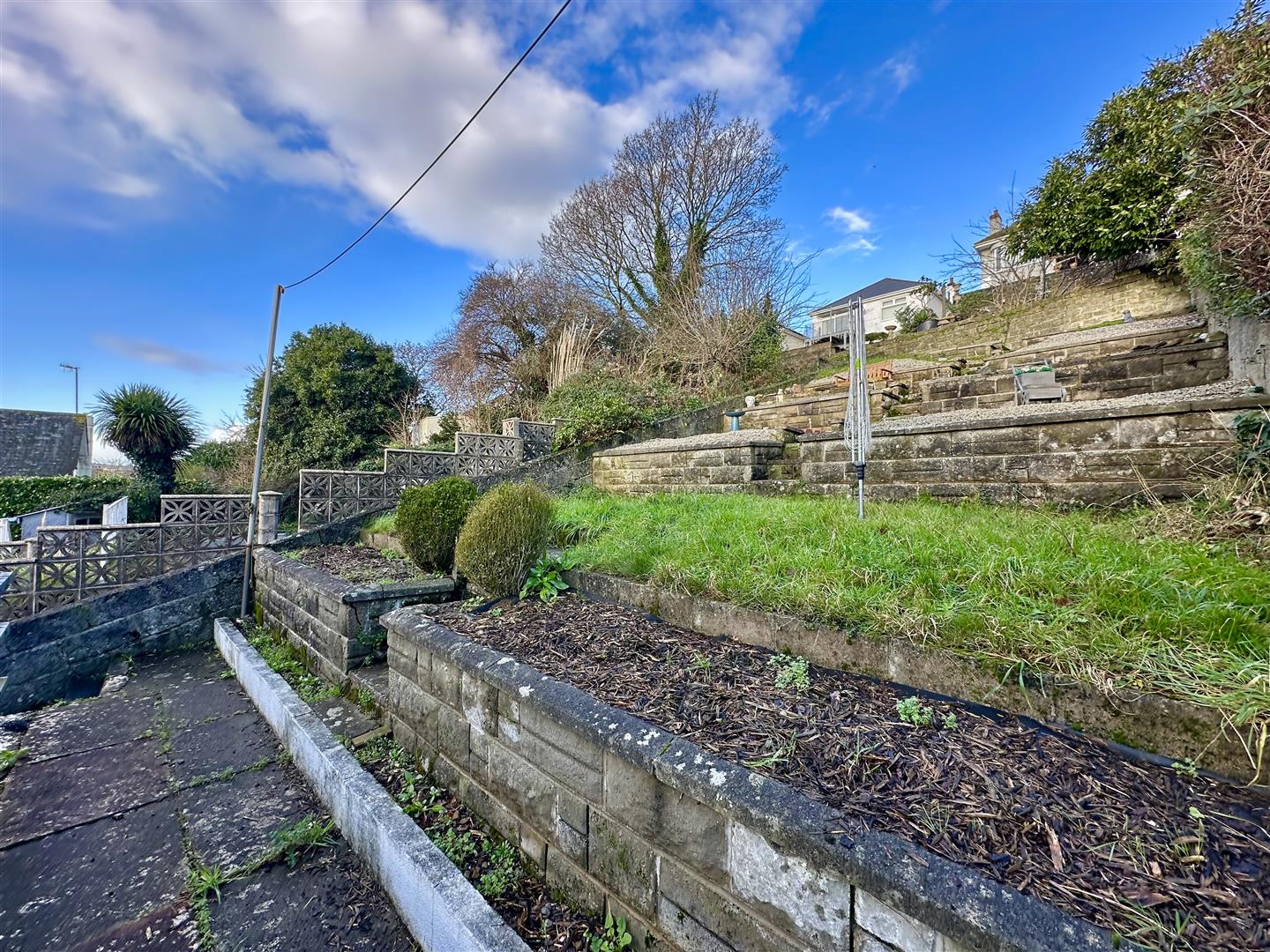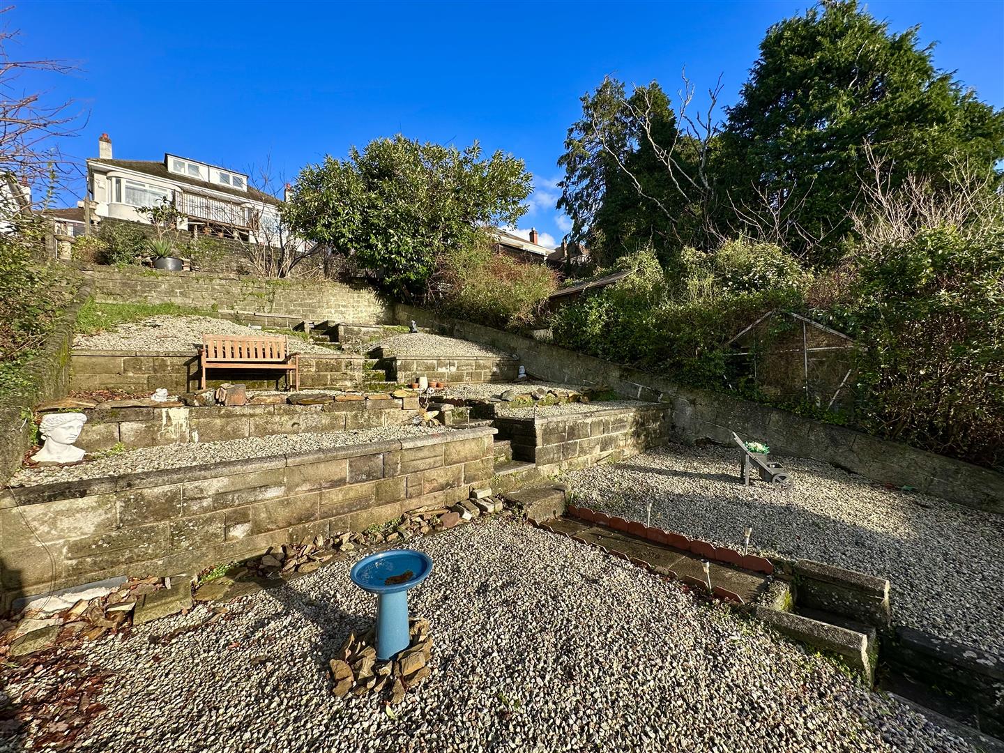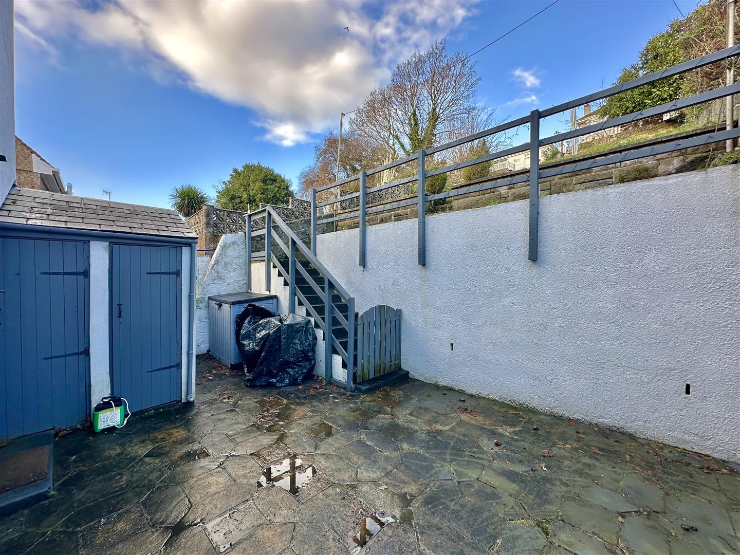 Enclosed paved courtyard seating area. Boiler cupboard outside housing the ideal Logic combination boiler. Utility cupboard which has space for a tumble dryer. Wooden gate gives access to the side path. Picket gate opens up to steps which lead up to the main section of the rear garden which is laid out over a number of terraces. Stone chippings.
