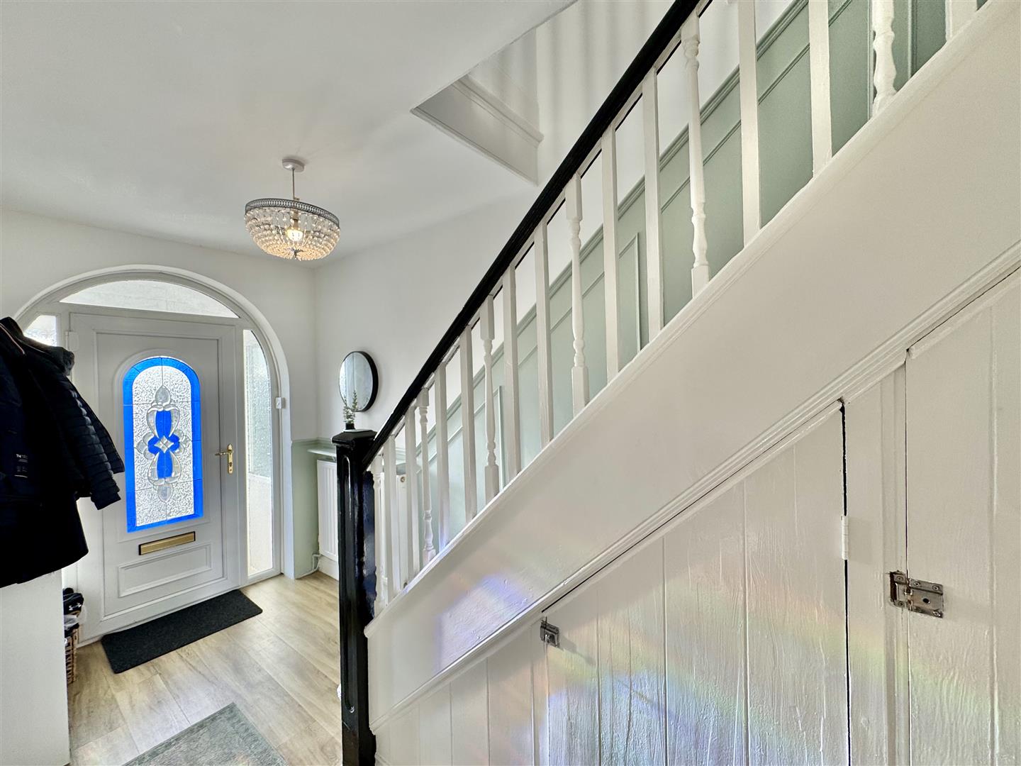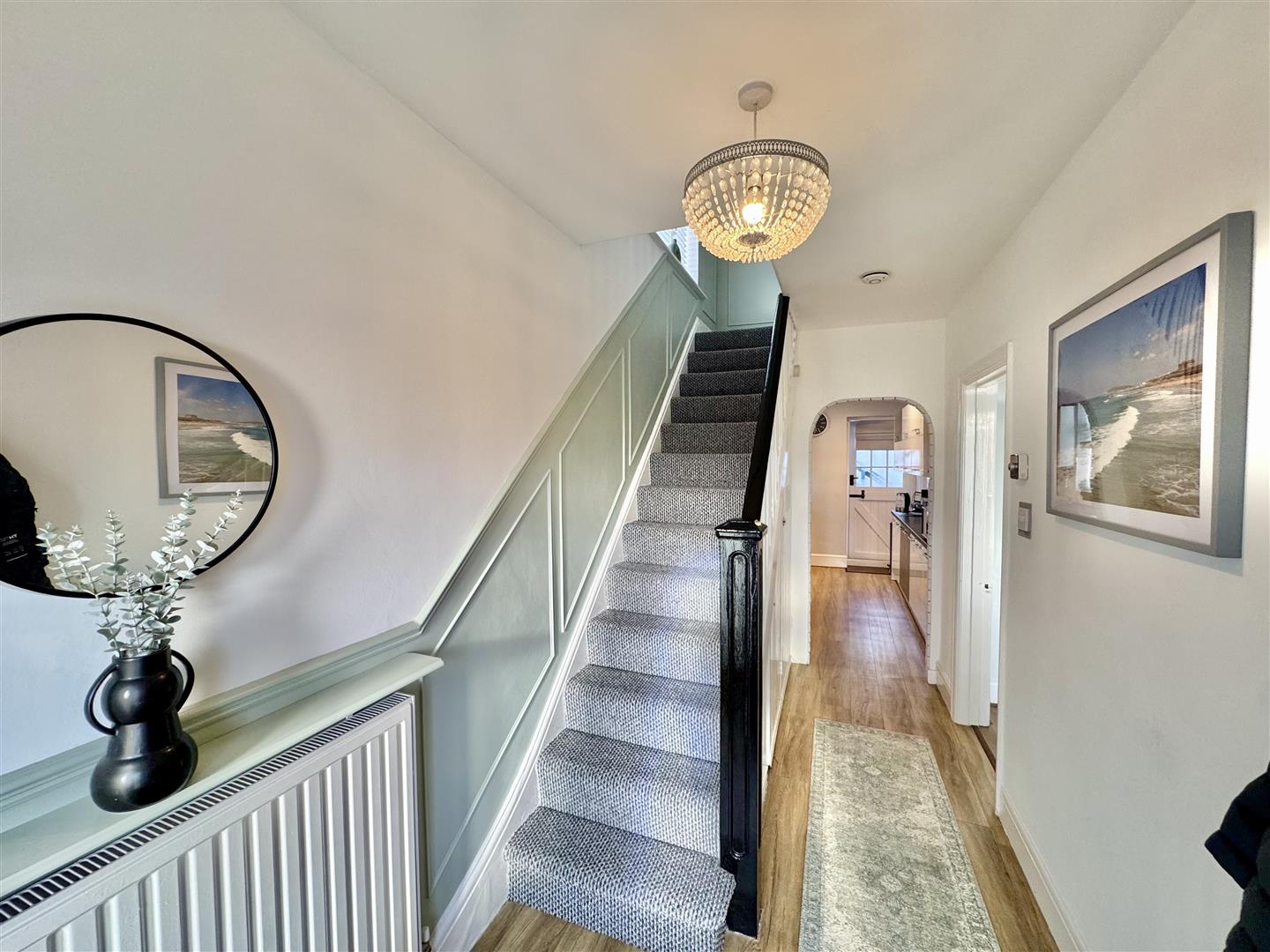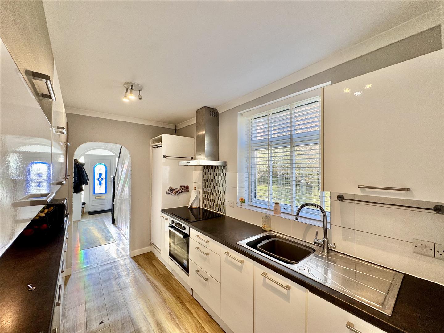 Wood effect laminate flooring, staircase rising to the first floor landing. 2 hooded under-stair storage cupboard. Archway which opens up into the kitchen & a door with a glazed panel which opens up into the lounge;