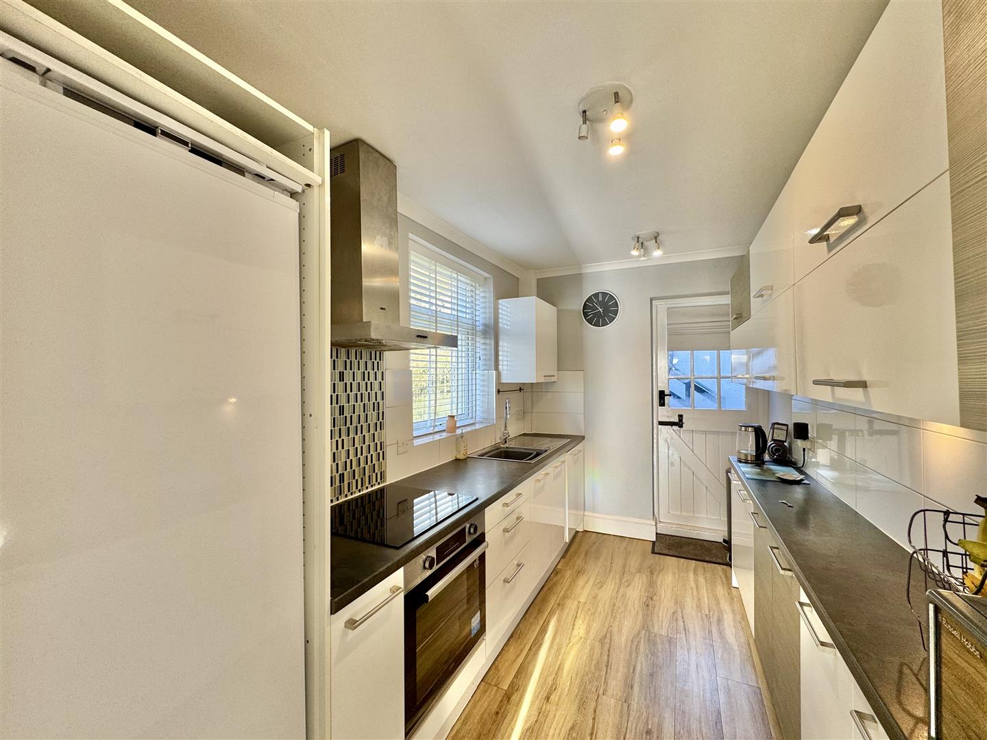 Attractive matching basin & wall mounted units to include; integrated fridge, oven & washing machine. Roll edge laminate work surface which has an inset four ring induction hob. Stainless steel sink unit with a mixer tap. Tiled splash-back. Extractor fan over induction hob. uPVC double-glazed window to the side. Continuation of the wood effect laminate flooring. A wooden stable-style door with glazed panels which opens up out to the rear garden.