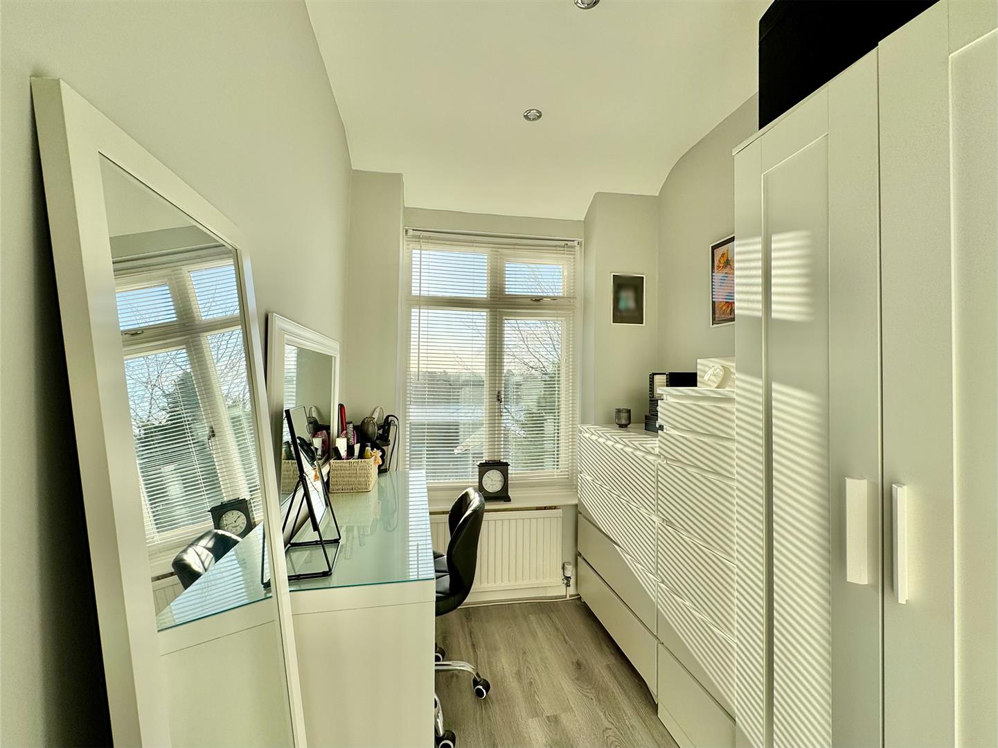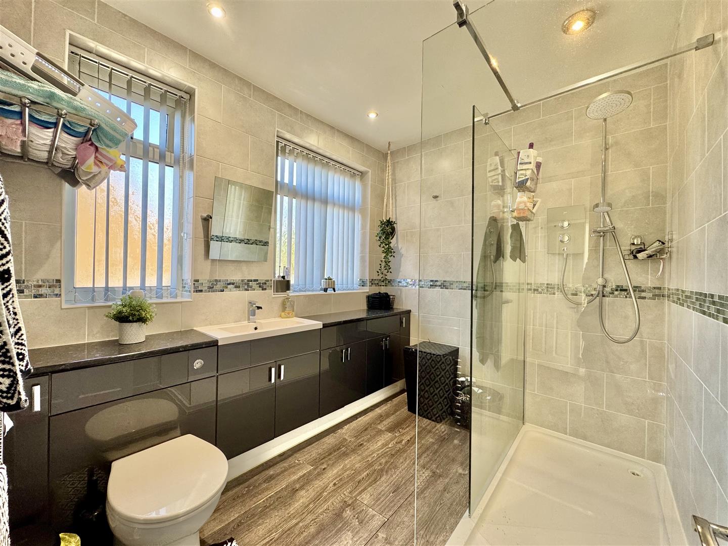 Attractive suite with twin walk in shower cubical, dual shower heads both handheld and rainfall. A closed coupled wc with hidden sister wash hand basin, inset into high gloss vanish storage cupboards below. Tiled walls. Chrome heated towel rail. Ceiling spotlights. Twin obscured uPVC double-glazed windows to the side. Extractor fan. Grey wood effect laminate flooring.