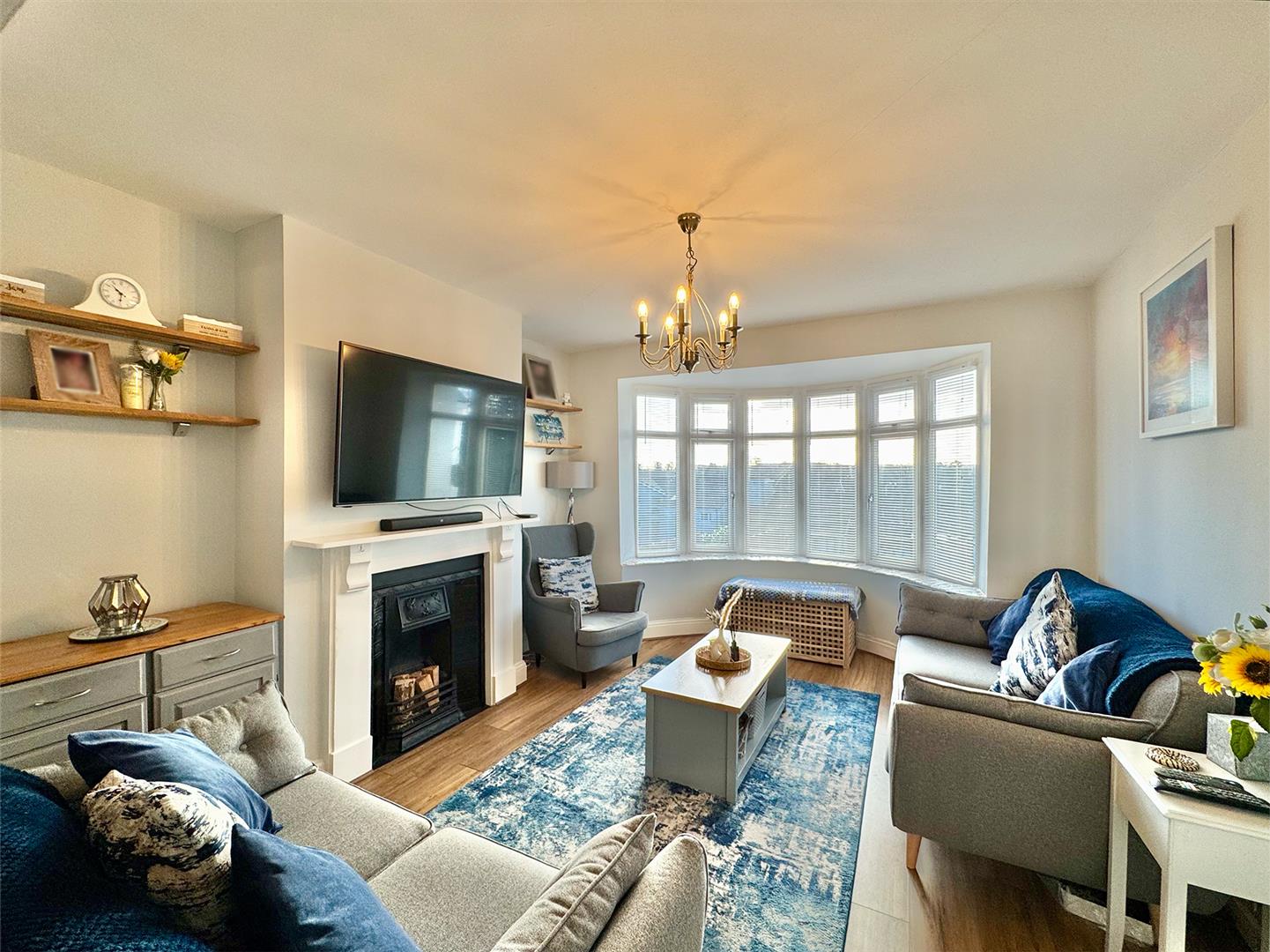 Feature fire place with wooden mantle & surround. Cast iron inset with an open grate. Curved uPVC double-glazed bay window to the front with views over the River Plym. Wood effect laminate flooring. Square arch which opens up into the dining room;