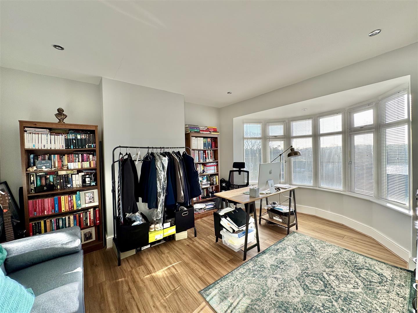 Laminate wood flooring. Currently acting as a study. Ceiling spotlights. Curved uPVC double-glazed bay window to the front, with an overlooking view of the River Plym.