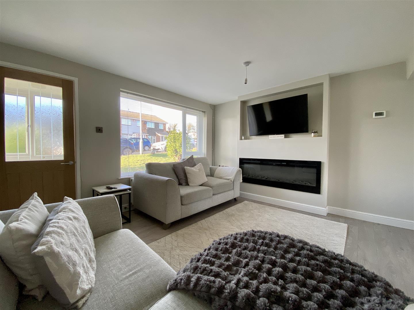 Feature fireplace with an electric fan fire, inset into the chimney breast with a media wall section for a TV above. Staircase rising to the first floor landing. uPVC double-glazed window to front. Grey wood effect vinyl flooring. Square arch opening into the dining room;