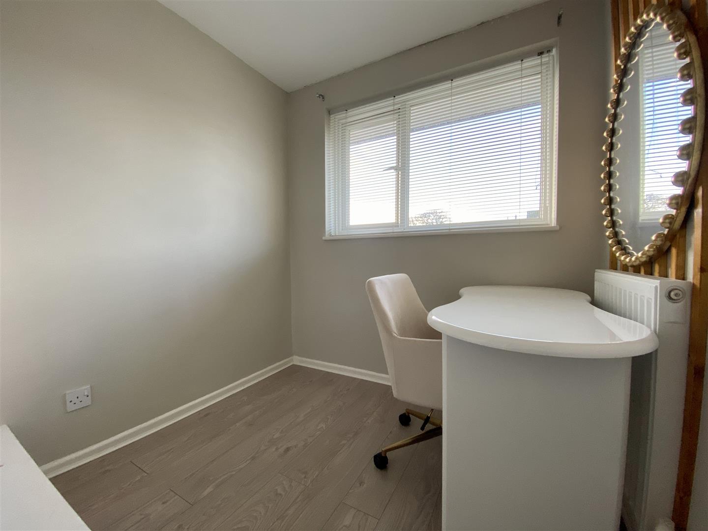 uPVC double-glazed window to the front. Grey wood effect laminate flooring. Restricted floorspace where the stairwell rises. Fitted wardrobe built with hanging rail, open quarter storage & shelving.