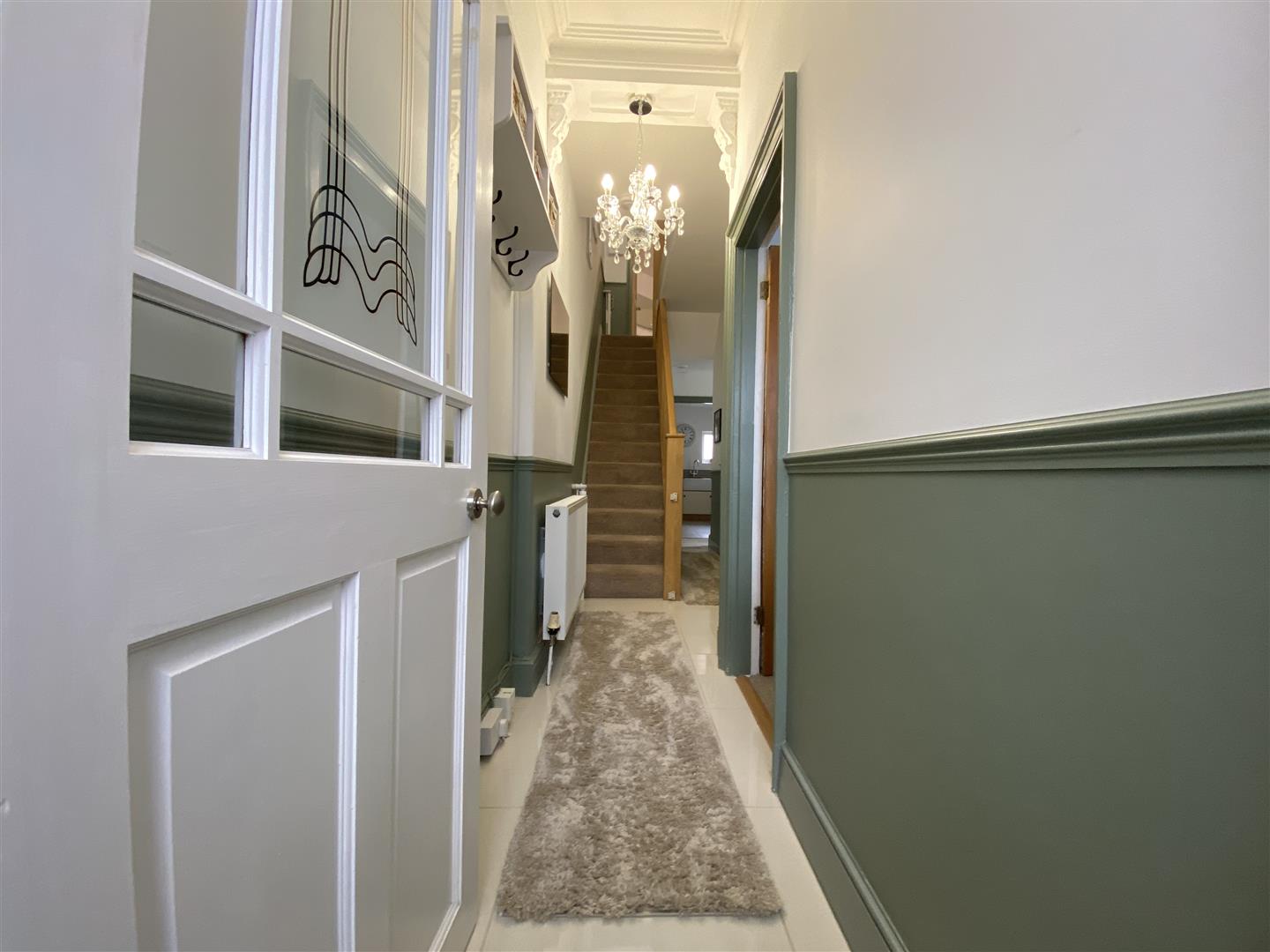 Ceramic tiled floor with underfloor heating. Staircase rising to the first floor landing with under-stairs storage cupboards, one of which acts as a utility cupboard which is for a washing machine & tumble-dryer. Doors leading off through to the lounge, dining room, kitchen & further uPVC obscured double-glazed door which opens up out to the rear garden. Dado rail.