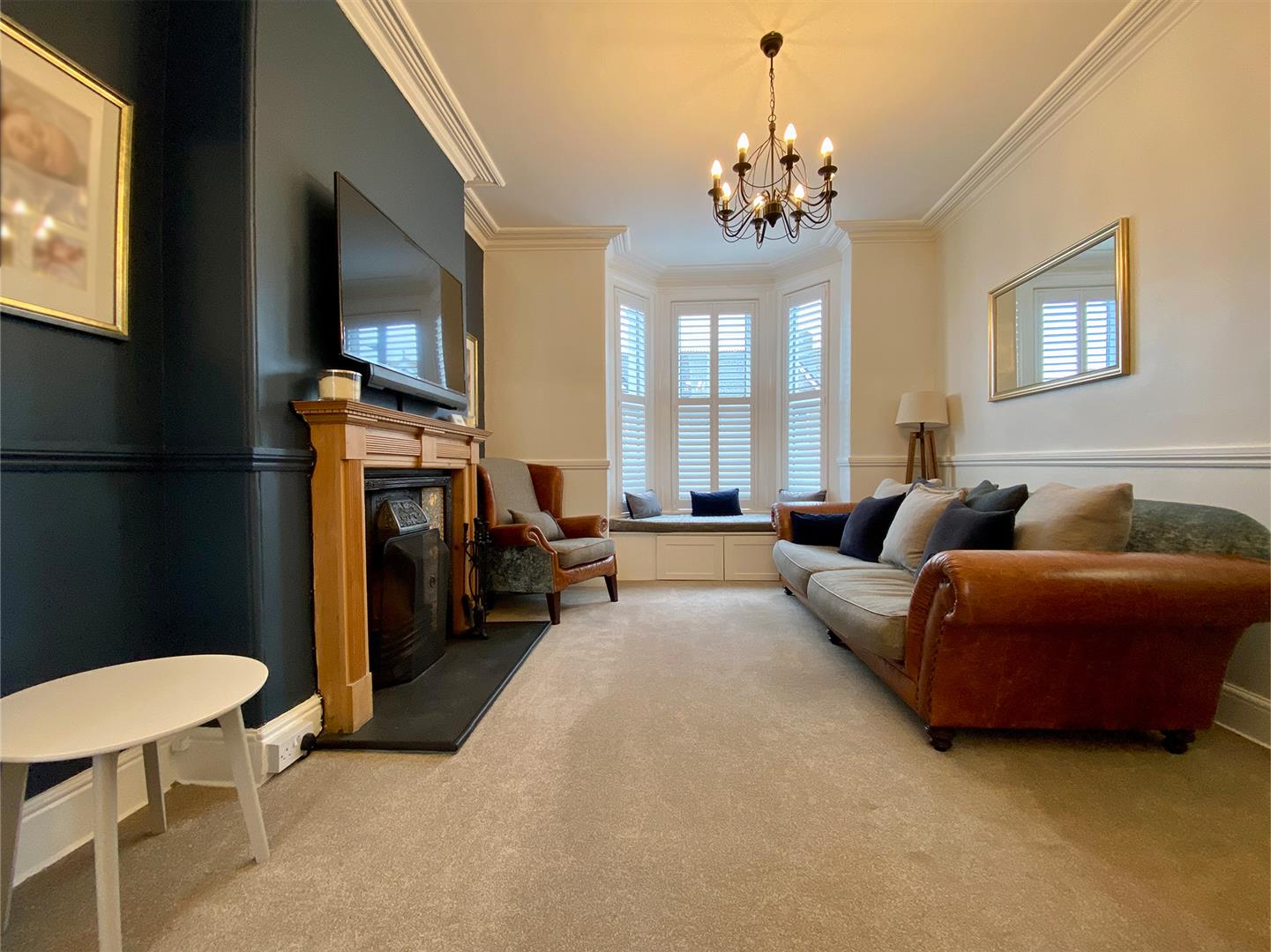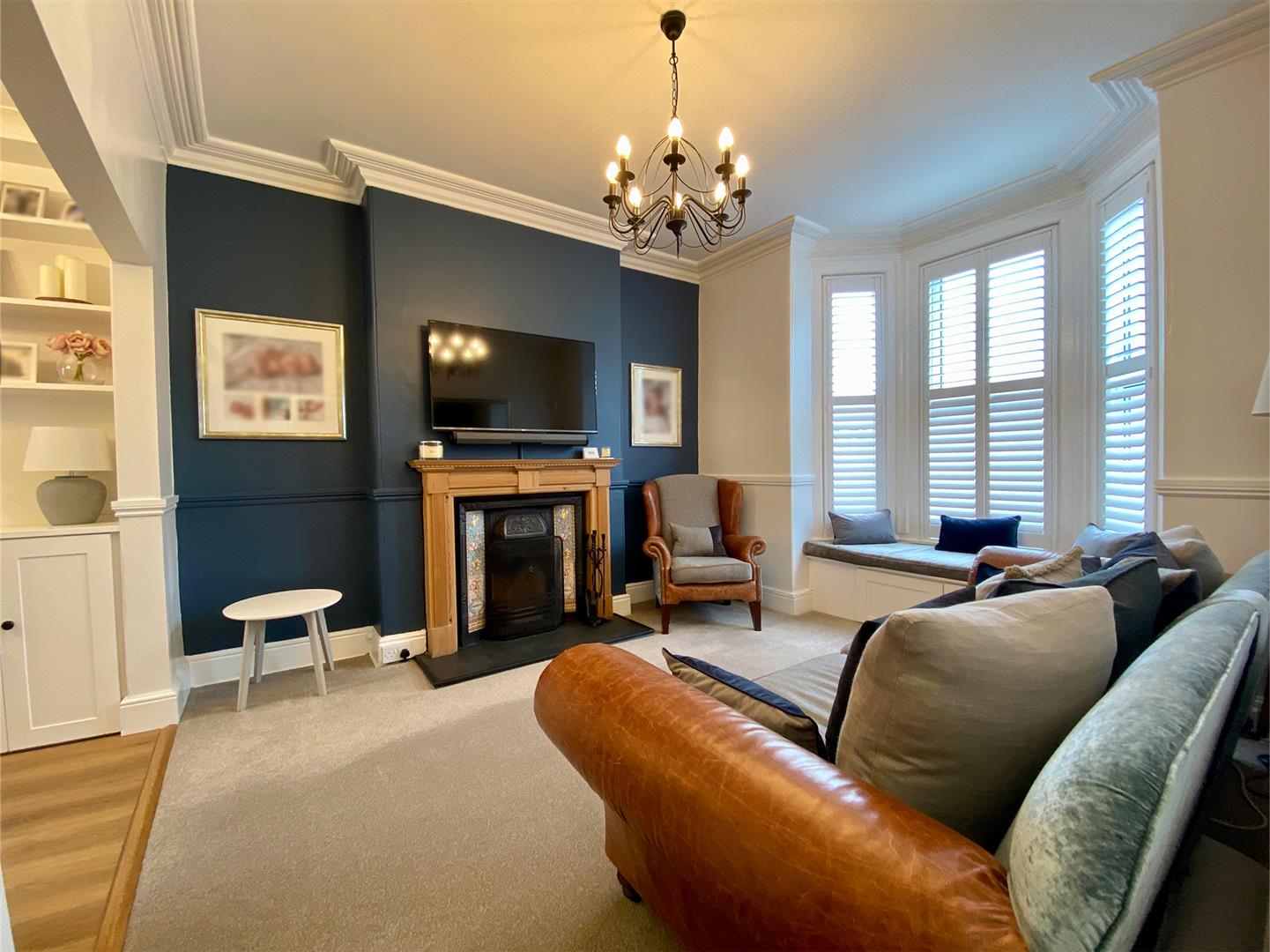 Working fireplace with wooden mantle & surround, cast iron inset with decorative tiles & an open grate. uPVC double-glazed bay window to the front with fitted shutters & a window seat with storage cupboards under. Dado rail. Covings. Square arch which opens into the dining room.