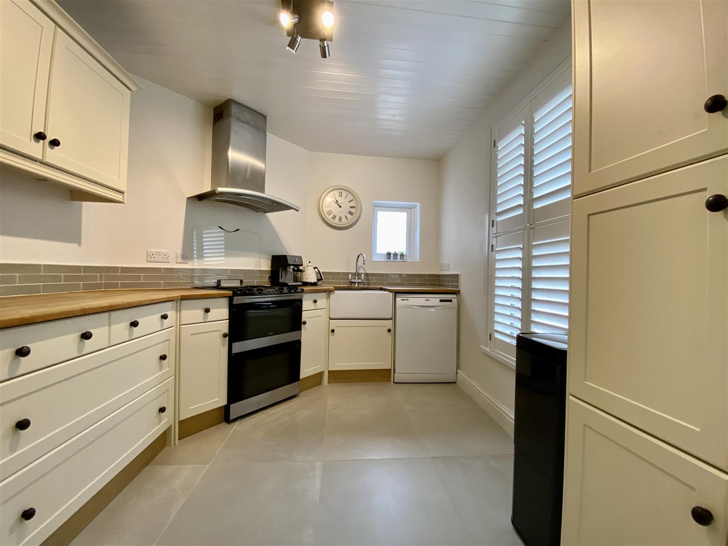 Attractive matching base & wall mounted units to include space for a cooker, dish washers & upright fridge/freezer. Roll edge oak work surface has inset Belfast sink with a mixer tap. Tiled splash-back. Extractor hood. Obscured uPVC double-glazed window to the rear & a further uPVC double-glazed window with fitted shutters to the side. Ceramic tiled floor.