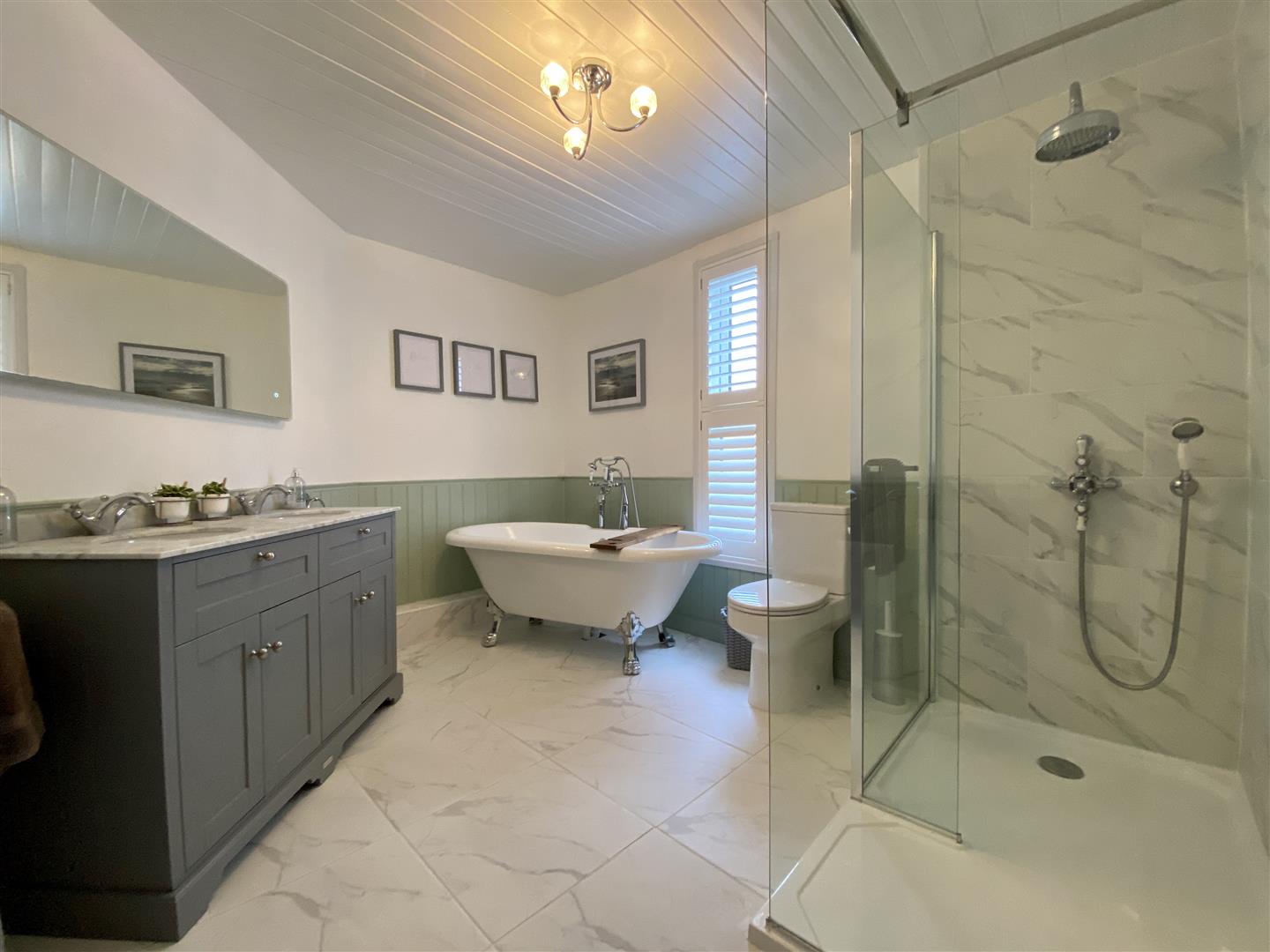 Opulent suite consisting off a 4 claw free standing bath. Twin shower cubical with fitted shower, dual shower heads both rainfall & handheld. Close coupled wc. His & Her sinks inset into vanity storage cupboards below. Wood panelling to dado height. Obscured uPVC double-glazed window to the side with fitted shutters. Ceramic tiled floor.