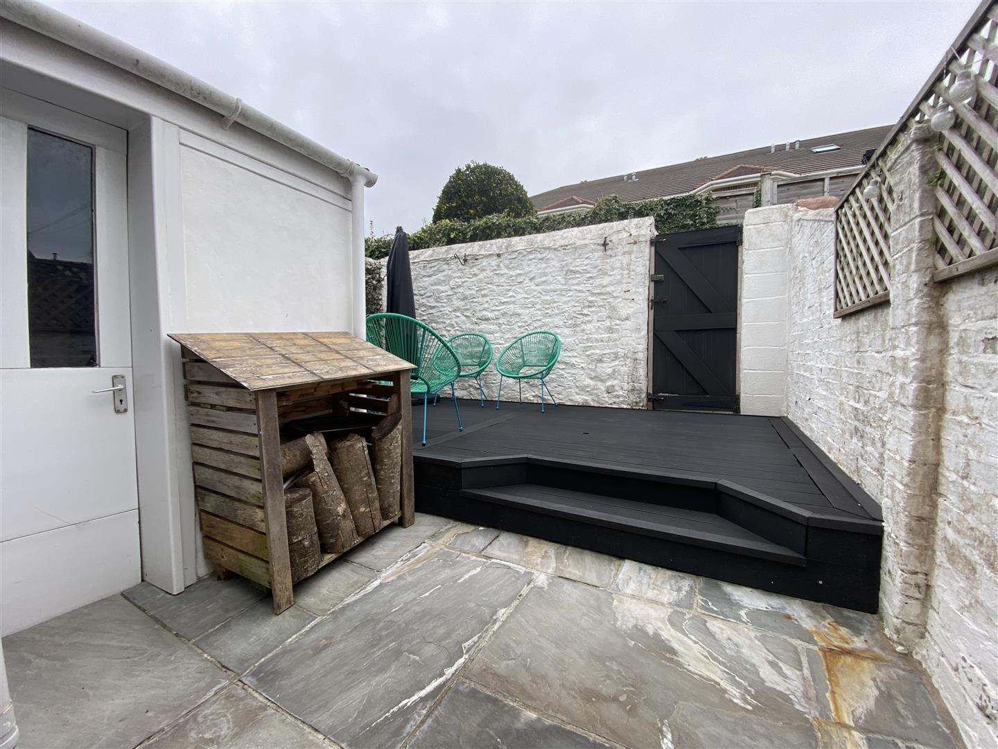 To the rear an enclosed garden with slate paved path running alongside the property to a raised composite decked seating area with access to a garden shed. Courtesy gate giving access out to a walkway to the rear.