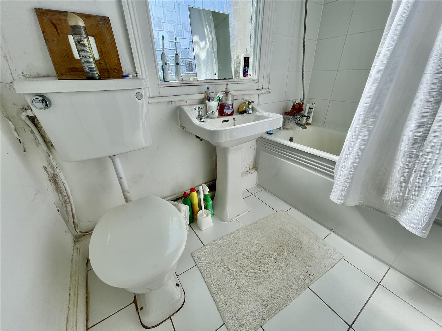 Obscured glazed-window to the rear. White suite with wc, pedestal wash hand basin & panelled bath with mixer tap & wall mounted shower attachment. Tiled splash-backs.
