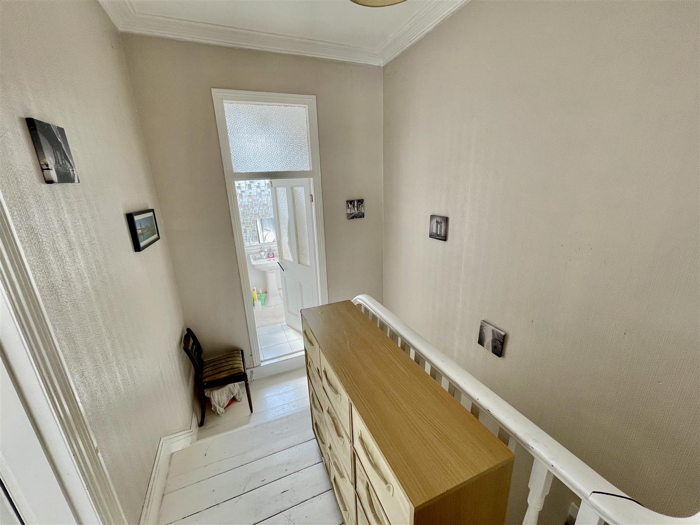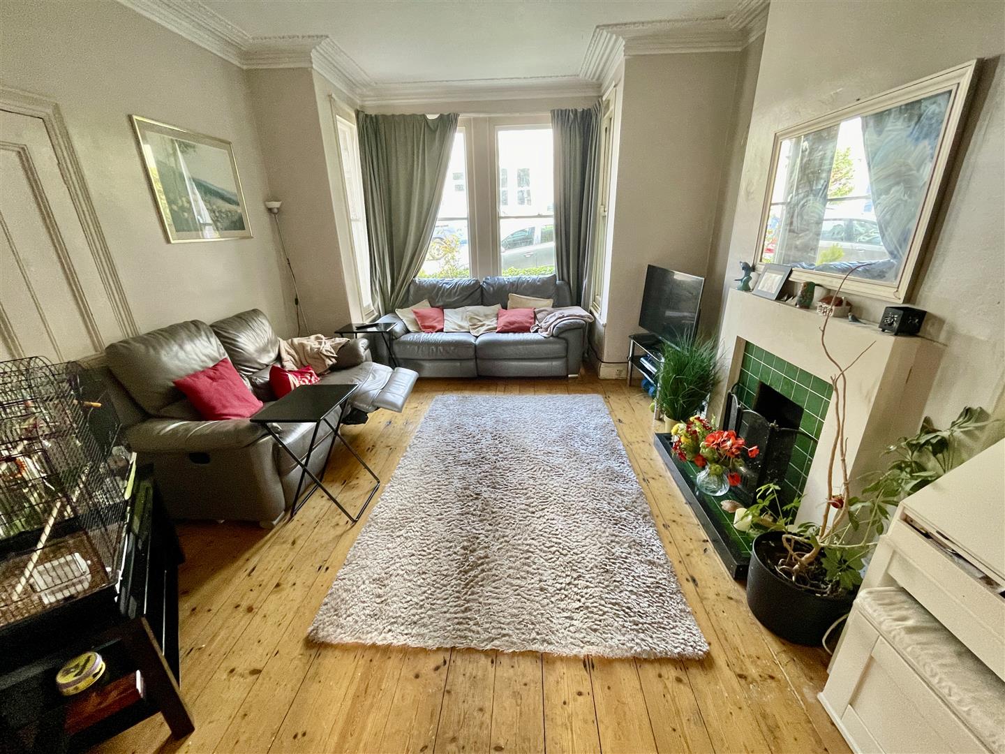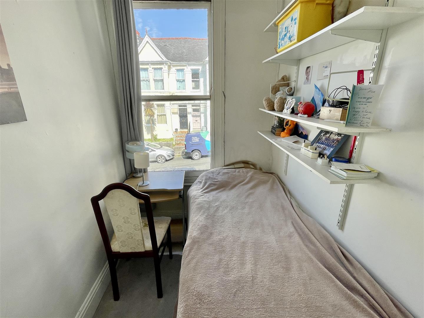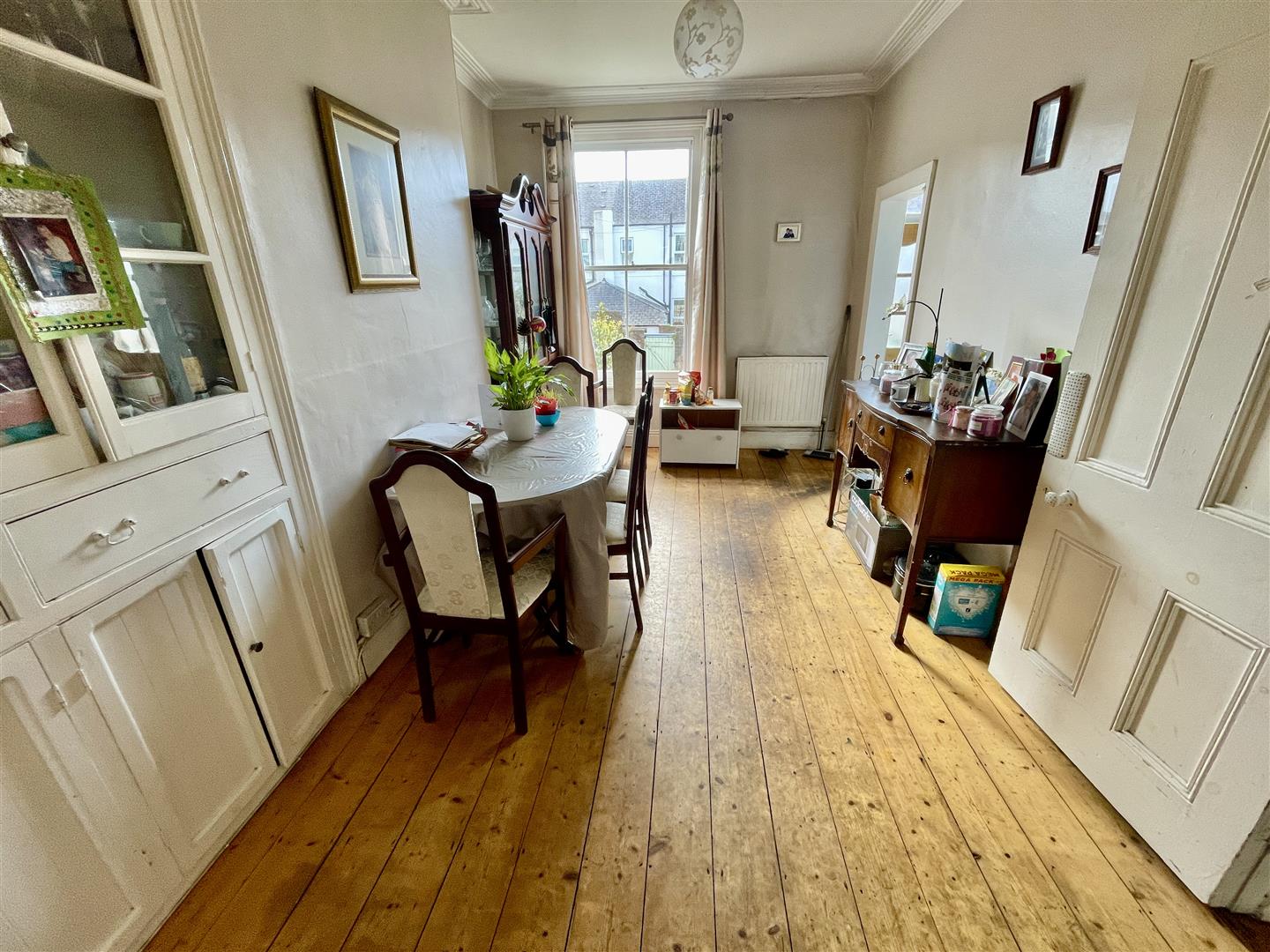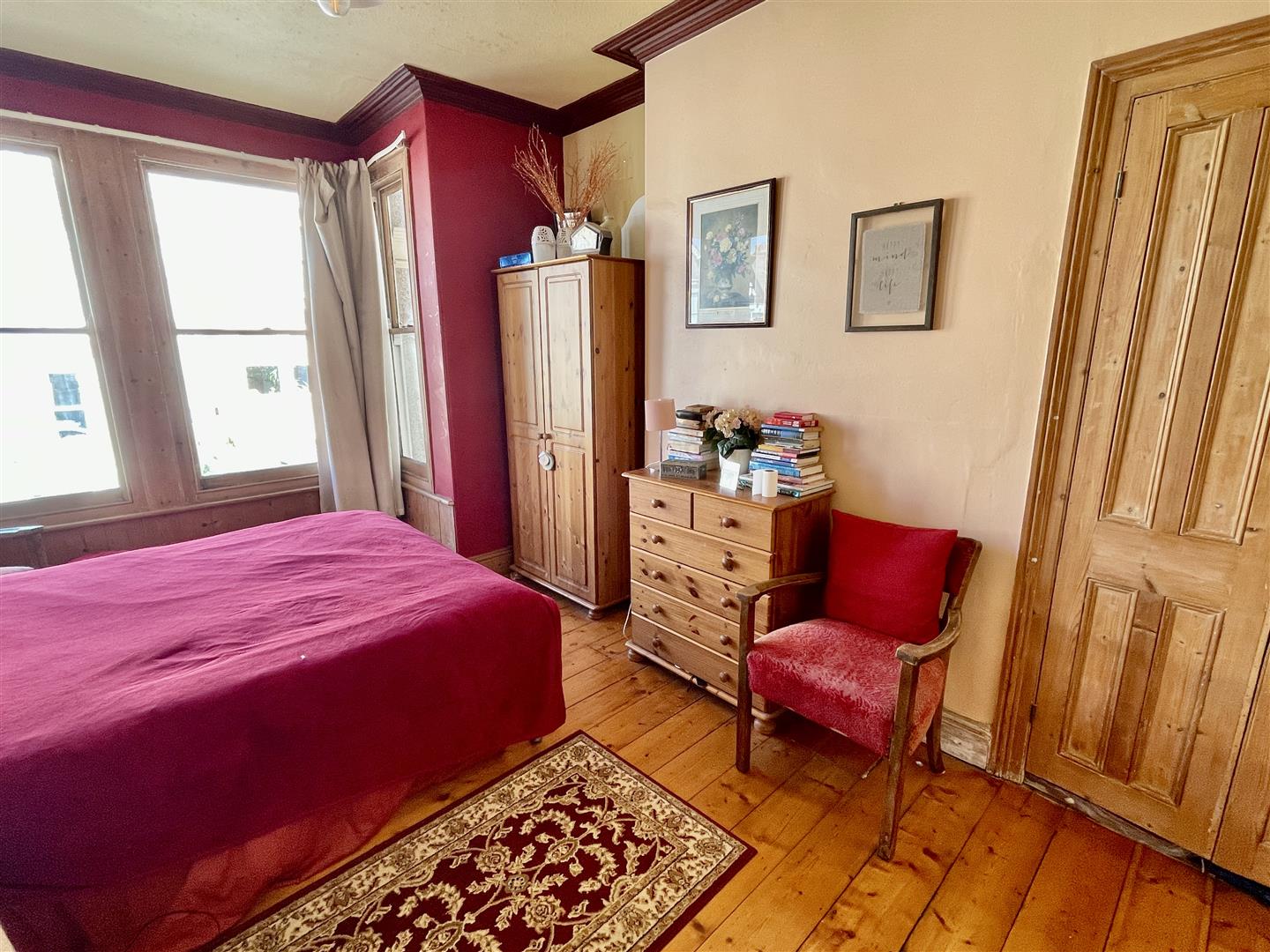 Box bay window to the front elevation. Coved ceiling. Chimney breast with built-in cupboard to the right.