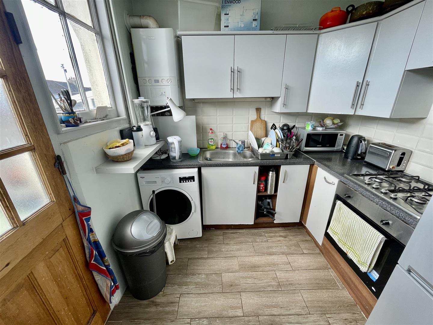 Panelled part-glazed stable style door to the rear with adjoining window. Fitted with a range of cupboard & drawer storage. Roll edge work-surfaces. Metro tiled splash-backs. 1.5 bowl sink unit. 4 ring gas hob. Electric oven. Space for an upright fridge/freezer. Wall mounted Ideal Logic gas fired boiler servicing the central heating & domestic hot water.