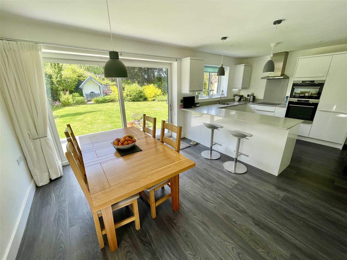Light and airy with window to the side, wide double glazed patio doors overlook and open from the dining area to the rear garden and a further picture window with outlook from the kitchen. Quality fitted integrated kitchen with Silestone worksurfaces along three sides and incorporating breakfast bar, matching splashbacks, under mounted stainless steel sink with chrome mixer tap. Excellent range of integrated AEG appliances include, microwave combination oven and fan assisted oven, both with grills, induction hob with splashback and illuminated extractor hood over, automatic dishwasher, and upright fridge/freezer. Various lighting including downlighters in the kitchen area, and three pendant lights. Walk-in understairs larder cupboard.