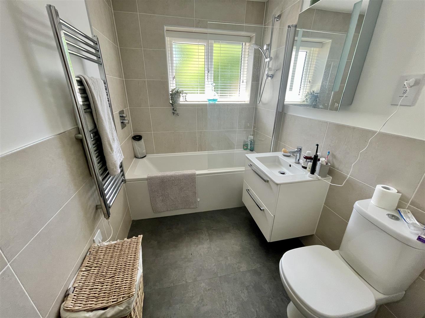Patterned obscured window to the side. Quality white suite with wc, wall hung wash hand basin with drawer under, adjacent shaver socket, panelled bath with mixer shower over, tiled splashbacks and electrically heated chrome towel rail.